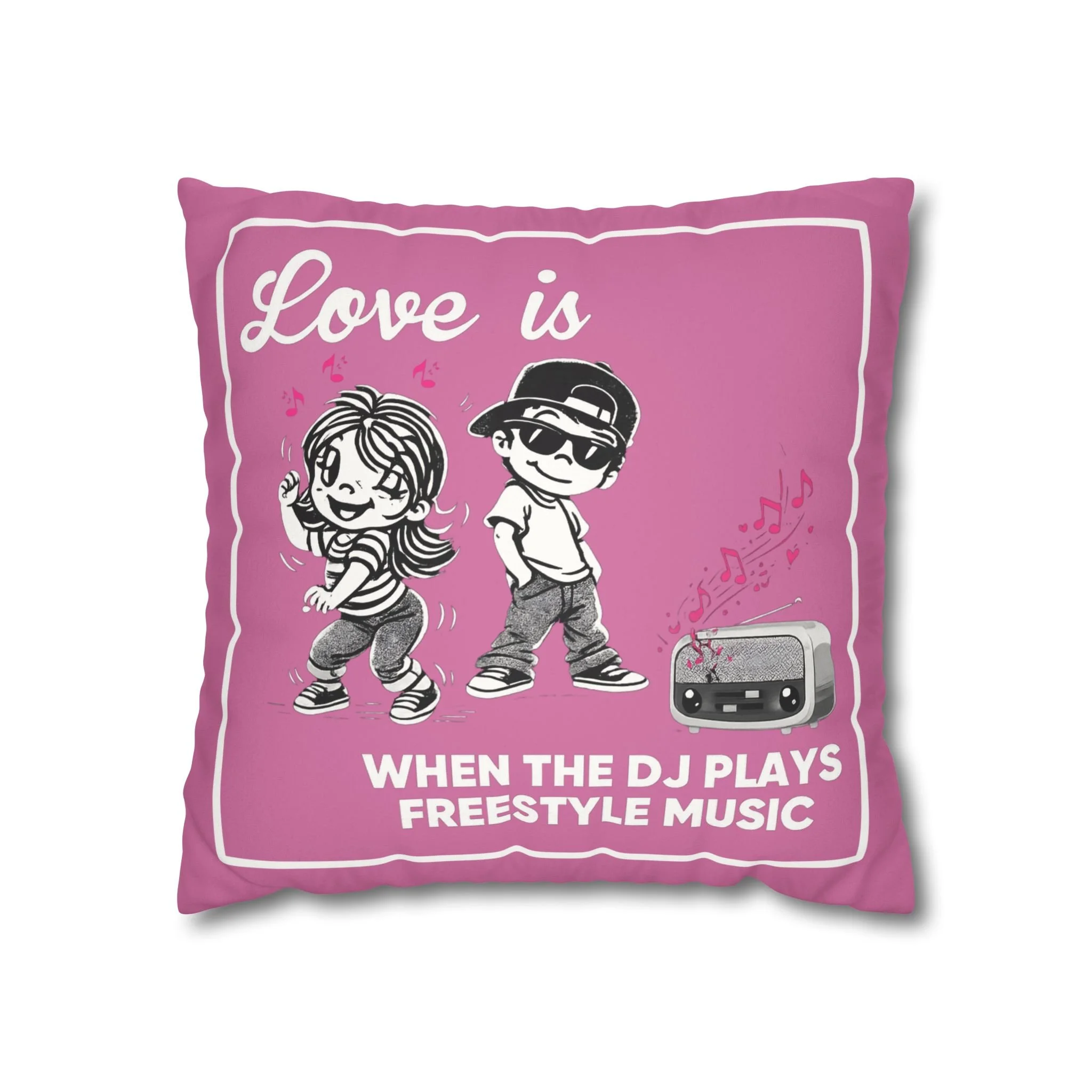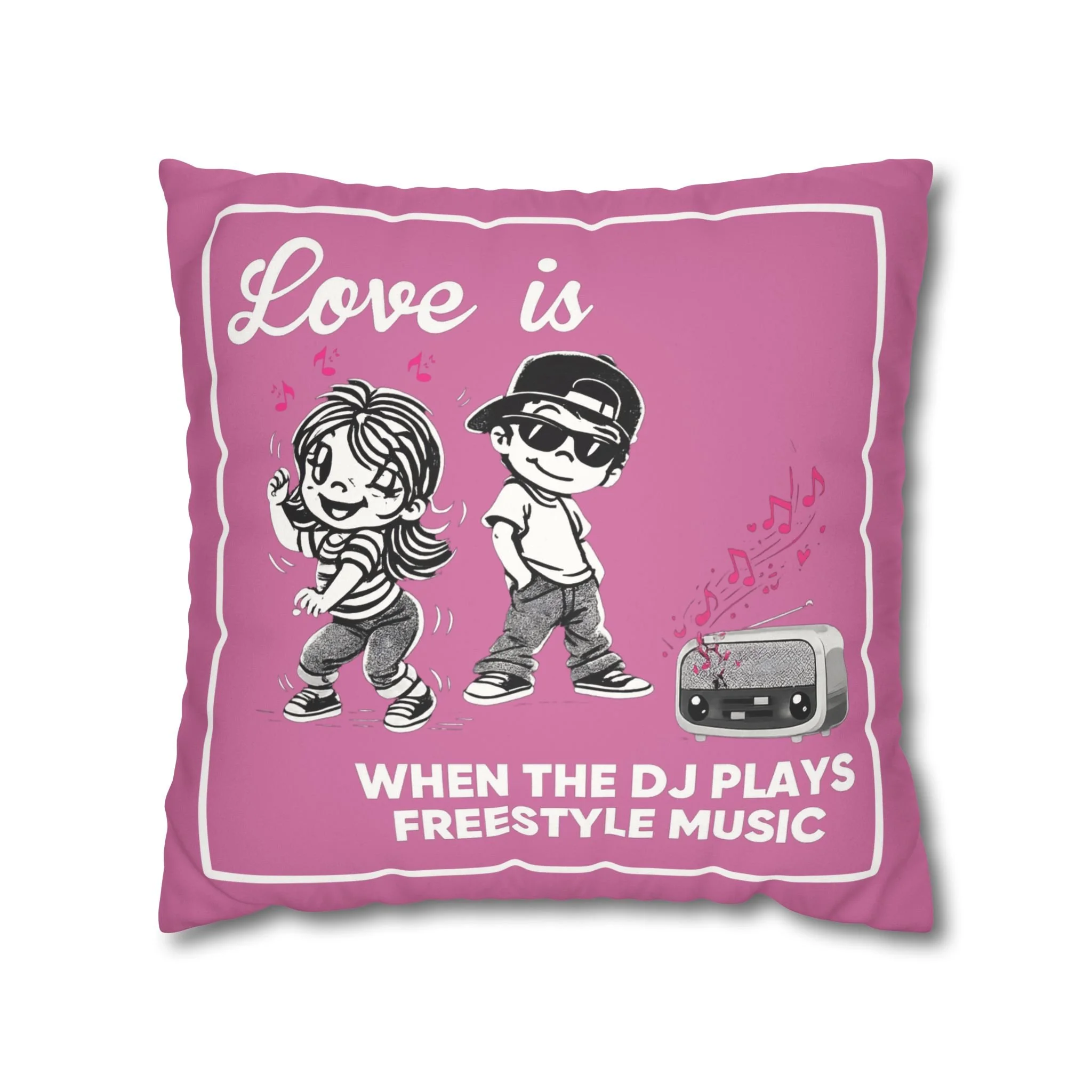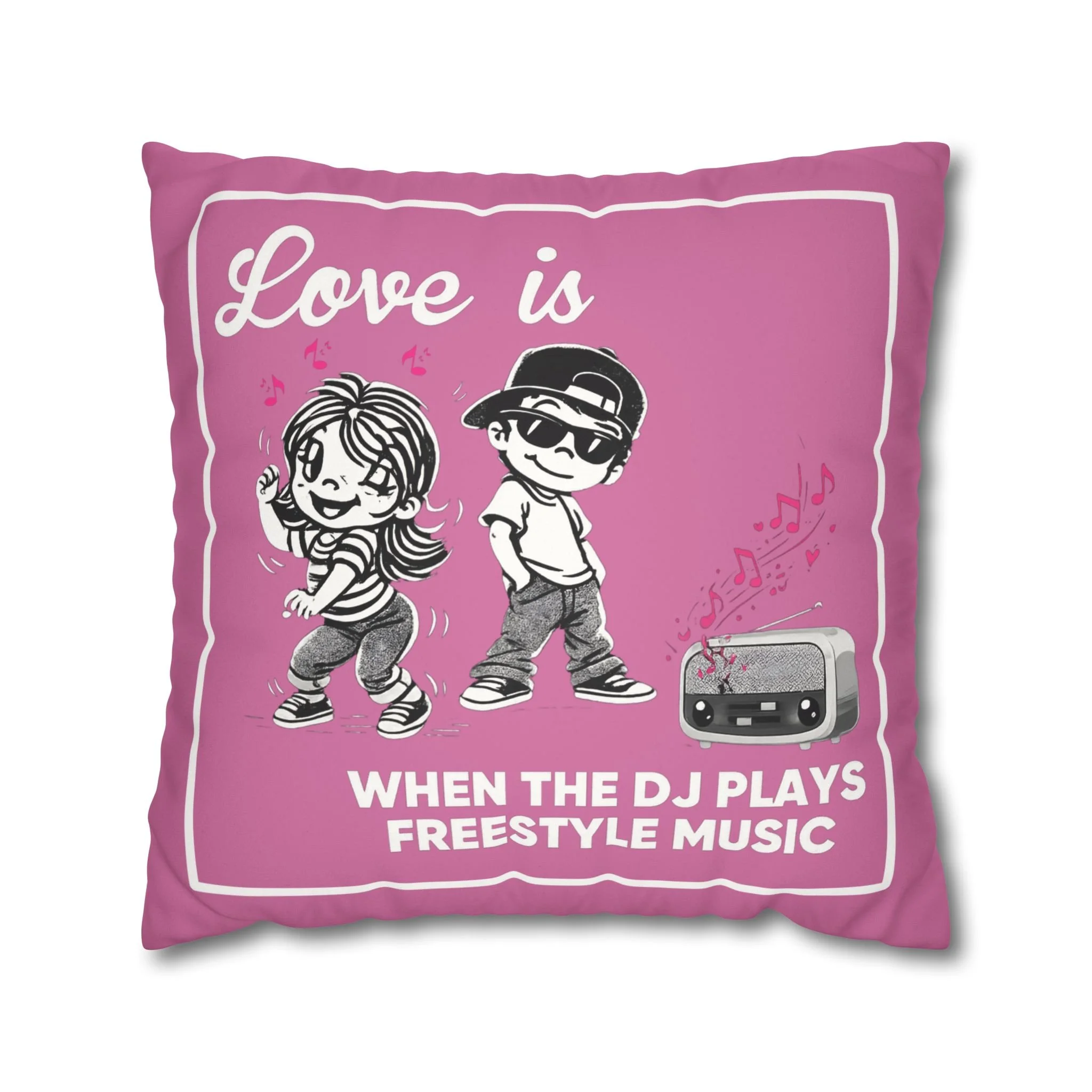 Celebrate the soundtrack of real love with this playful, retro-styled Freestyle Music pillow. Featuring a cute cartoon couple and a classic old-school radio, this design brings all the warm, nostalgic vibes of those unforgettable freestyle jams.